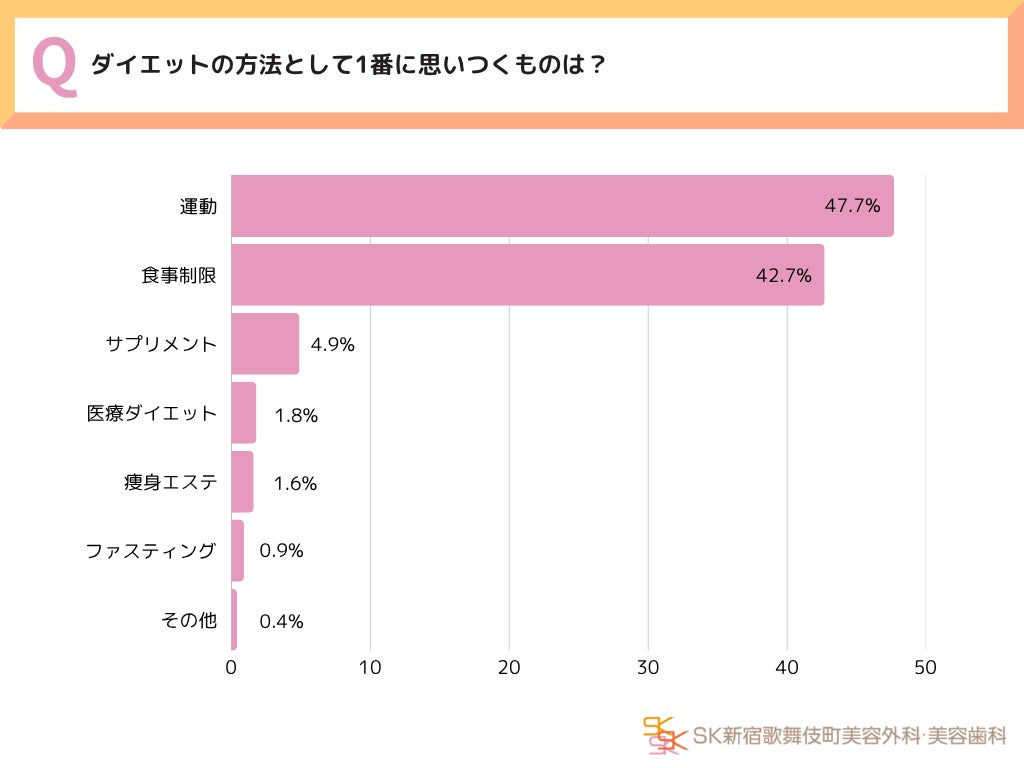 「ダイエットの方法として1番に思いつくものは?」という問いでは、「運動」(47.7%)と「食事制限」(42.7%)が圧倒的多数を占めました。一方で「医療ダイエット」は1.8%、「痩身エステ」は1.6%と、専門的な手法はまだ一般には浸透していないことがわかります。多くの人が「まず思い浮かぶ方法」として、従来から知られる“自力で頑張る方法”を選んでいます。SNSやテレビなどで身近に紹介される機会が多いため、運動や食事制限が圧倒的なイメージを持たれていることが伺えます。