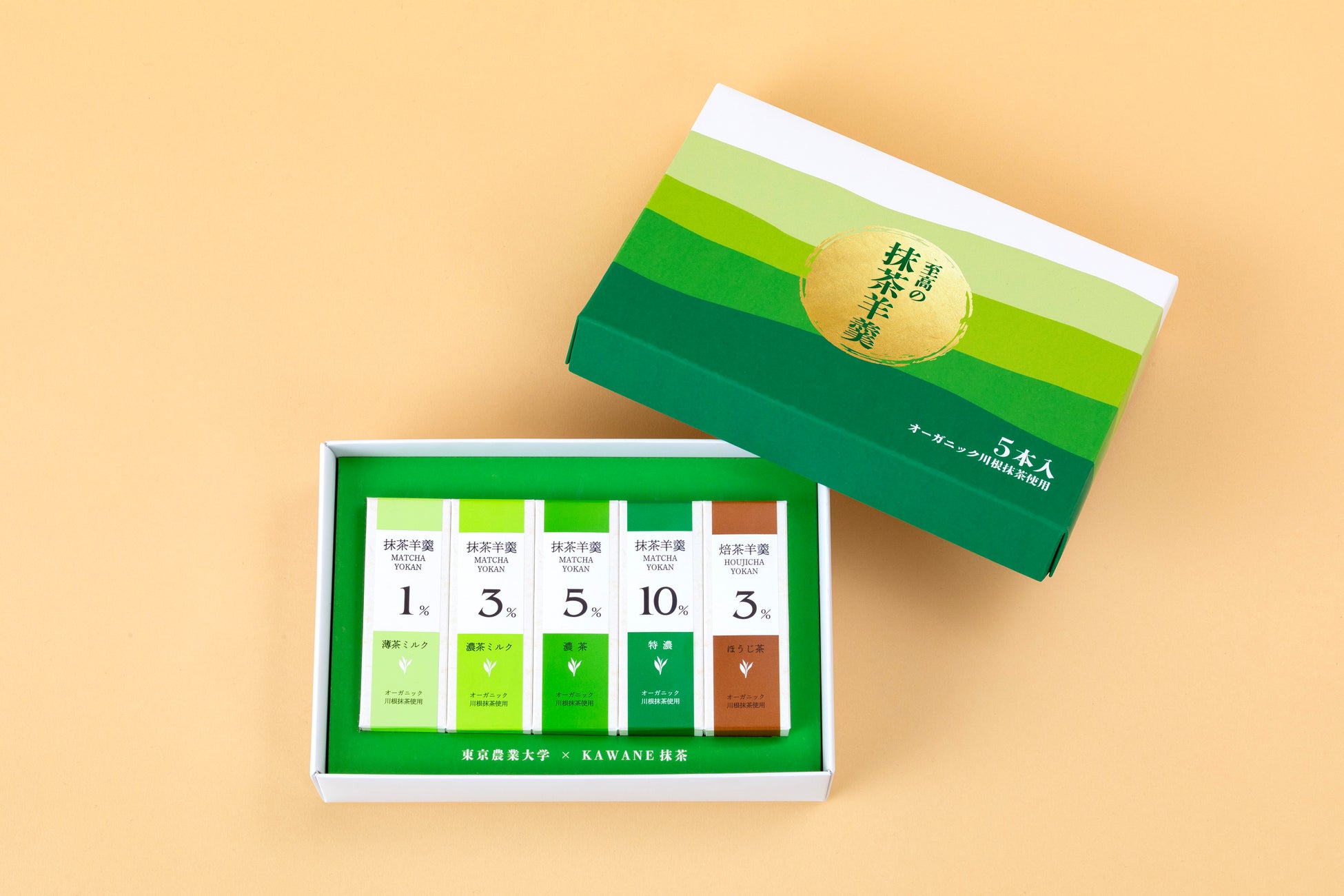 抹茶をふんだんに使った、濃厚な抹茶羊羹です。羊羹は抹茶味4本とほうじ茶味1本の5本セット。川根の有機抹茶をより楽しんでもらうため、抹茶味は濃さを【 1% / 3% / 5% / 10%】の4種類用意しました。10%の抹茶羊羹は、一般的な抹茶羊羹に比べてなんと20倍もの抹茶を使用しています。製造には青森県八戸市の「かねご製餡株式会社」さんにご協力いただき、何度も試作を重ねることで、味も風味も最大限に楽しめる抹茶羊羹に仕上げています。今回販売する商品は、東京農業大学の学園祭「収穫祭」で3日間で400個完売した自信作をリニューアル。おいしさをパワーアップさせました。