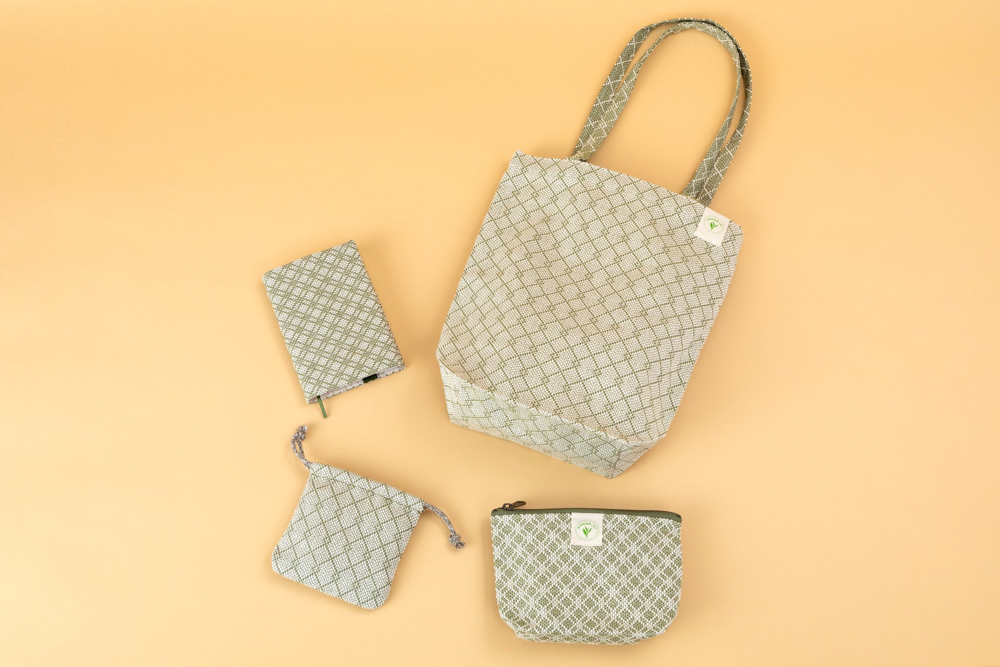 商品のラインナップは日常的に使える①巾着 ②ブックカバー ③ポーチ ④トートバッグの4点です。