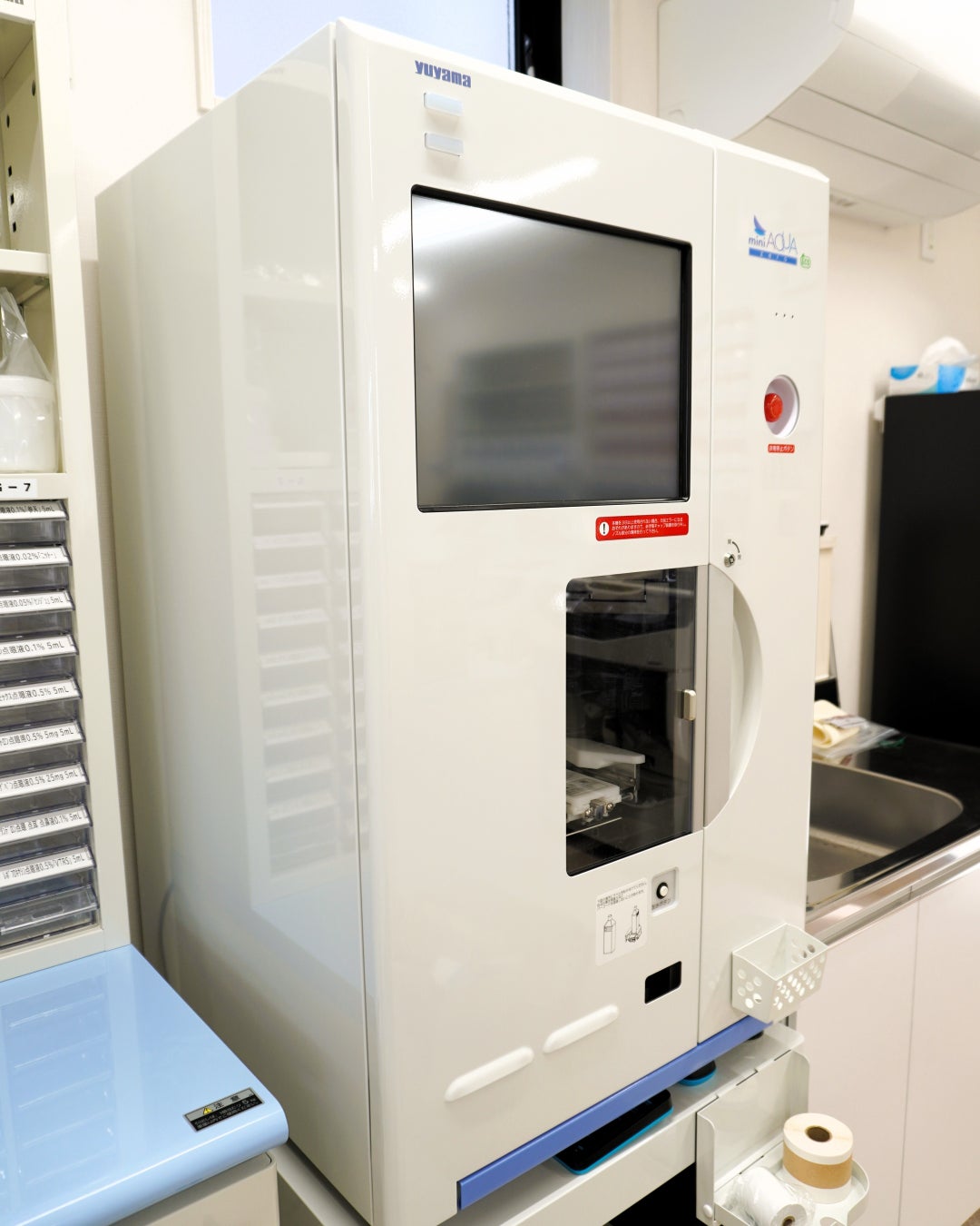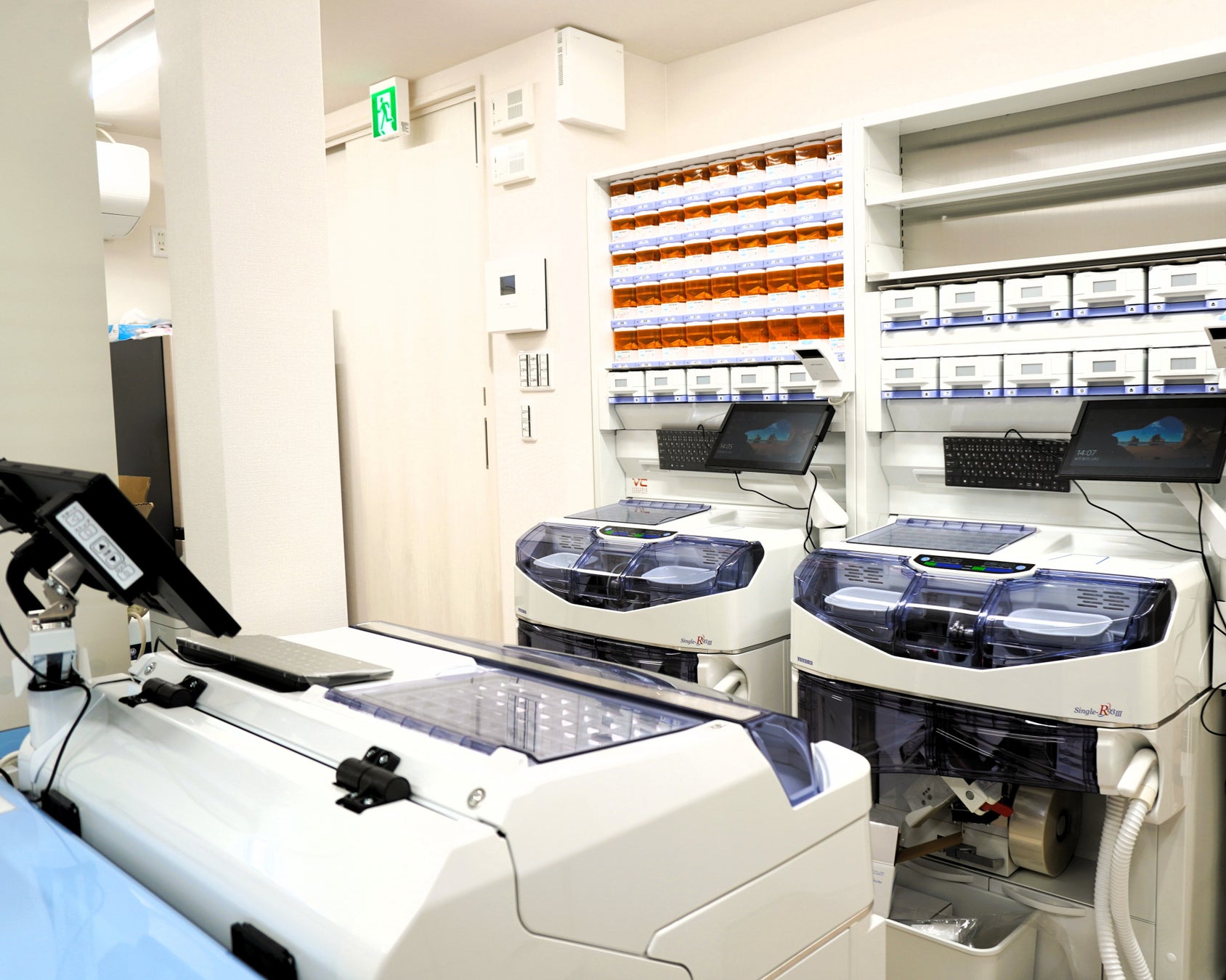 薬剤師が患者さんとのコミュニケーションに十分な時間を確保できるように、一包化、水剤、散剤などの手間と時間がかかる調剤については、最新の調剤機器を導入。調剤の自動化により生み出された時間で、薬剤師が患者さんとの対話を通じ、服薬の課題の発見、不安の解消などに尽力します。