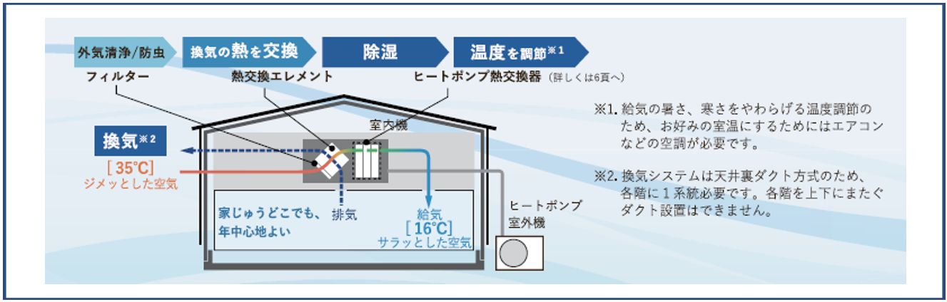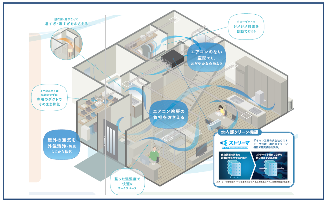 ソーラーサーキット リフレア™は、室温を下げずに除湿できる再熱除湿機能を備えた換気システムです。除湿することで冷えてしまう空気を温め直し、室内に供給します。ソーラーサーキット リフレア™は、サラッとした爽やかな空間で、やさしい住み心地を作り出すことに貢献します。