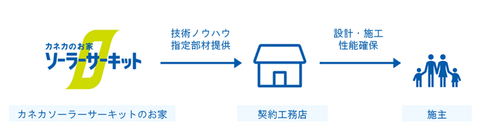 全国のカネカのお家 ソーラーサーキットの契約工務店へソーラーサーキットの技術ノウハウの実施権、及びソーラーサーキットを構成するのに必要な指定部材を提供しています。ソーラーサーキットの住宅を建築する際、及びソーラーサーキット リフレアTMを採用する際には、各エリアにあるカネカのお家 ソーラーサーキットの契約工務店との建築請負契約による施工が必要になります。