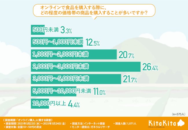 そこで、「オンラインで食品を購入する際に、どの程度の価格帯の商品を購入することが多いですか?」と質問したところ、『2,000円〜3,000円未満(26.4%)』と回答した方が最も多く、次いで『3,000円〜5,000円未満(21.7%)』『1,000円〜2,000円未満(20.7%)』と続きました。