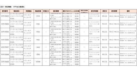 ◎東京都 優れた機能性を有する太陽光発電システム認定一覧(ソーラーエッジ製品抜粋)区分:周辺機器 PV出力最適化(PDF): https://www.tokyo-co2down.jp/wp-content/uploads/2023/04/5953a4f1ccedd018372a233b4d85c516.pdf