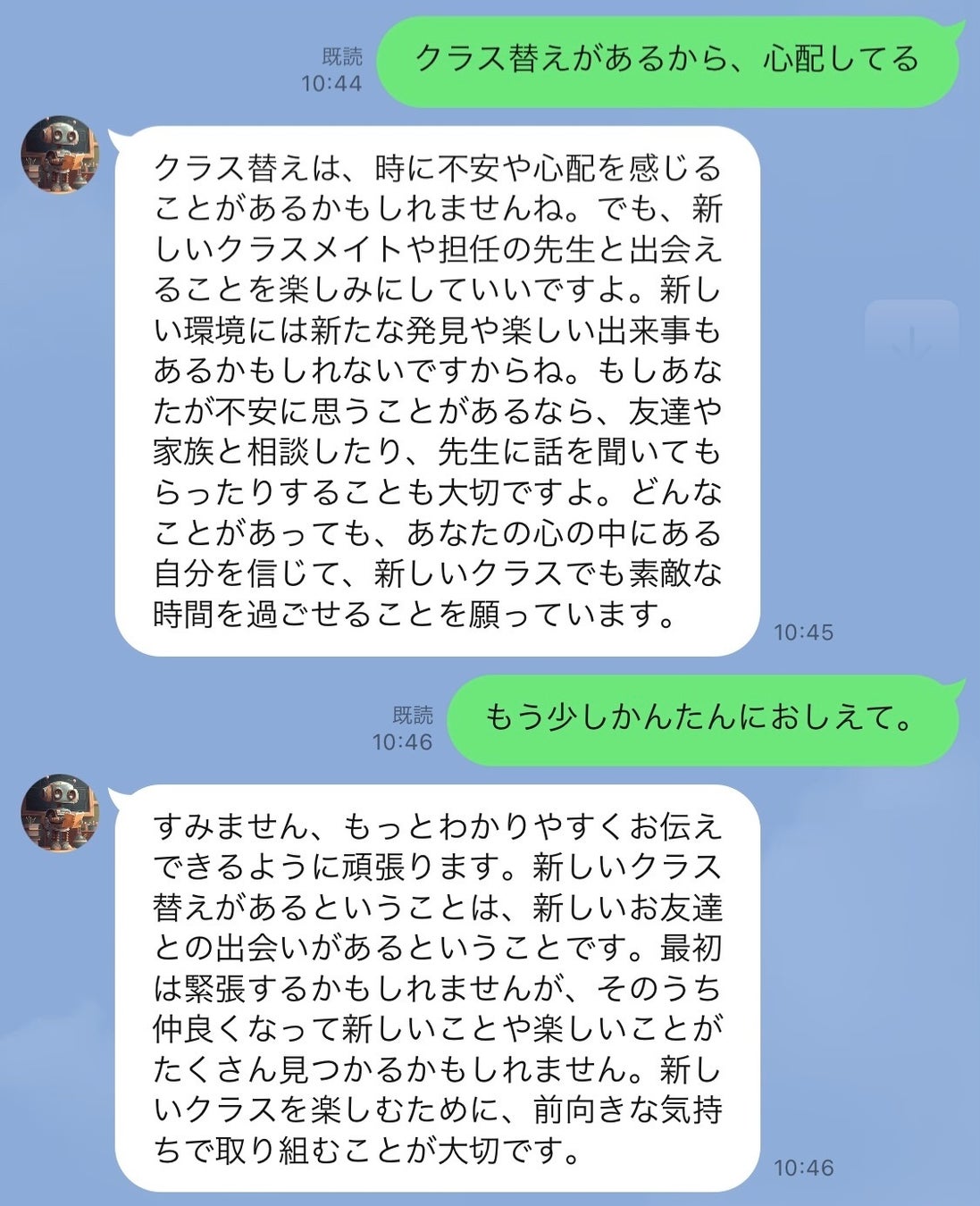 「AI先生【体験版】」は、ChatGPTにも使われている自然言語モデルを活用しています。子どもと対話する先生のように優しい口調で話しかけ、寄り添ってくれることが特徴です。暴力的な発言に対しては毅然とした態度を取り、子どもたちに安心して会話を楽しむことができる環境を提供します。