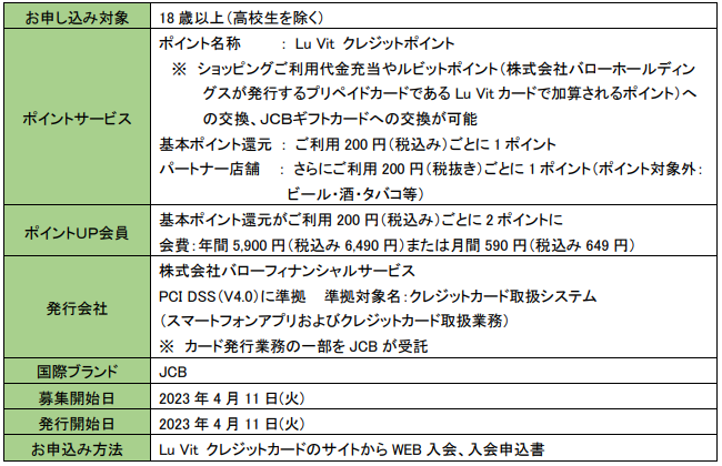 株式会社バローフィナンシャルサービス(本社:愛知県名古屋市、代表取締役社長:米山 智、以下「VFS」)と株式会社ジェーシービー(本社:東京都港区、代表取締役兼執行役員社長:浜川 一郎、以下「JCB」)は、2023年4月11日(火)より、JCBのタッチ決済を搭載したJCBブランドのクレジットカード「Lu Vit クレジットカード」の募集を開始したことをお知らせします。