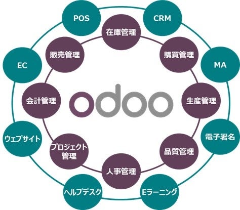 Odoo(URL:https://www.odoo.com/ja_JP/)はベルギー発のクラウド型統合業務パッケージです。基幹業務からECやマーケティング、CRMなど幅広いスコープを網羅しており、かつ重厚で融通が利かないと言われているパッケージが多い中、中堅中小企業でも身軽に導入できるパッケージとして世界中で非常に評価が高い製品です。