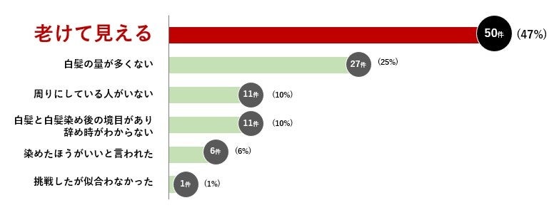 - 約6割はグレイヘアに挑戦したくないと回答。理由は「老けて見えるから」が最も多く、47%に上る。