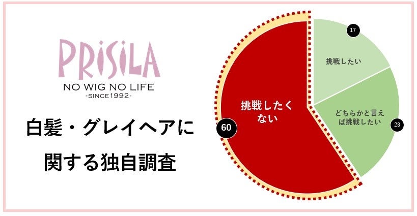 総合ウィッグメーカーの株式会社プリシラ(本社:兵庫県神戸市、代表:富澤 武志)は、主力商品「白髪隠しウィッグ」の累計販売個数が12万6000個を突破したことをきっかけに、新たにみなさまのお悩みに寄り添うために、ユーザーへのアンケート調査を実施いたしました。2018年にユーキャンが実施した流行語大賞にノミネートされて5年の年月が経過しました。様々なメディアでグレイヘアが紹介され、一定抵抗感が拭い去られた感があると感じましたが、未だに白髪への抵抗感が強いことが明らかになりました。