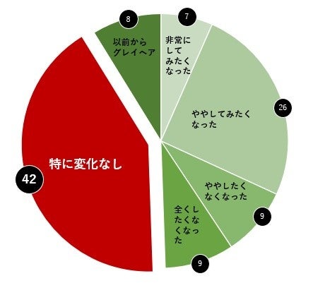 - 約5年間でのグレイヘアの意識は「特に変わらない」が最も多く約4割。挑戦したくなった人も3割にとどまる。