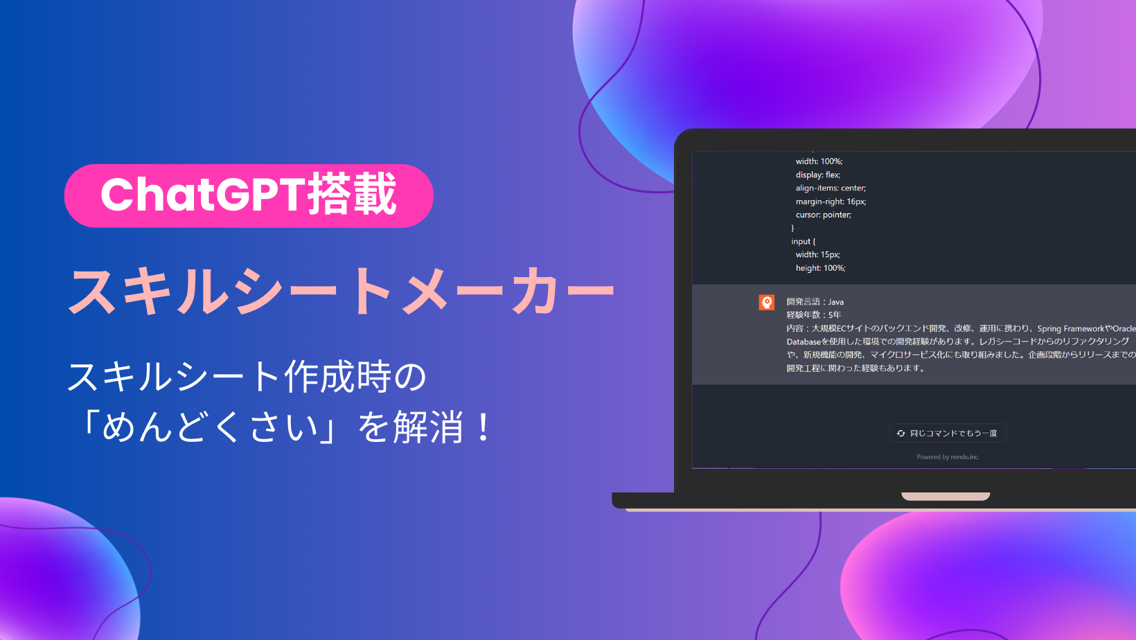 サービス概要:ChatGPTを搭載し、コードをコピペするだけで爆速でスキルシートを生成できるサービスです。