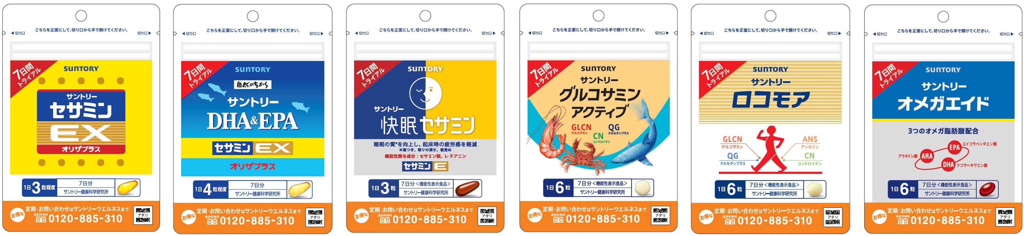 そのアドバイスのもと、興味を持ったお客様に健康食品を手軽に試していただけるよう、通常約30日分から提供しているサントリーウエルネスの健康食品6ブランド「セサミンEX」「DHA&EPA+セサミンEX」「快眠セサミン」「グルコサミン アクティブ」「ロコモア」「オメガエイド」の7日間お試しサイズを新たに販売します。