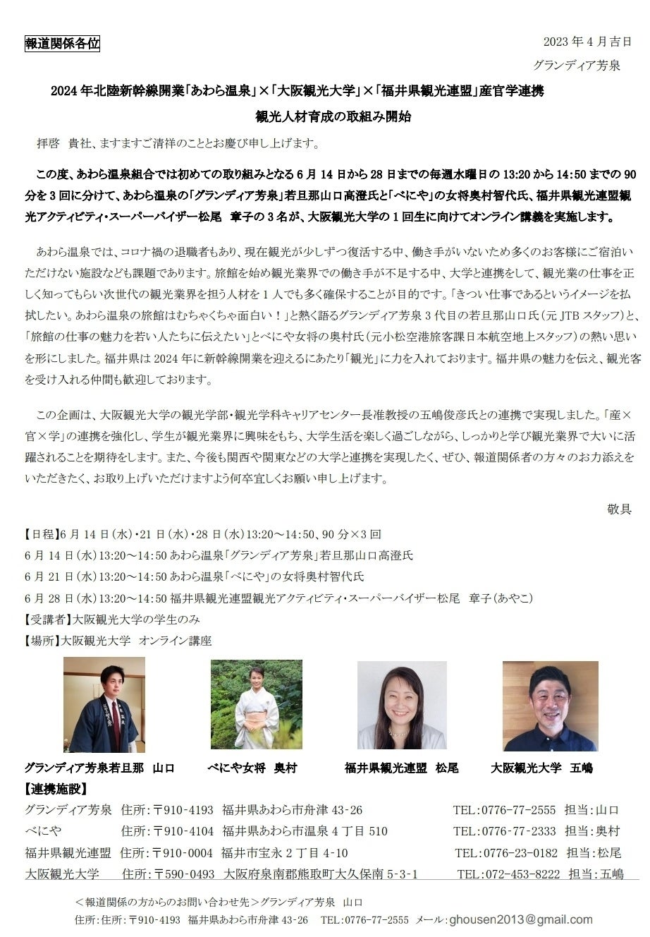 あわら温泉では、コロナ禍の退職者もあり、現在観光が少しずつ復活する中、働き手がいないため多くのお客様にご宿泊いただけない施設なども課題であります。旅館を始め観光業界での働き手が不足する中、大学と連携をして、観光業の仕事を正しく知ってもらい次世代の観光業界を担う人材を1人でも多く確保することが目的です。「きつい仕事であるというイメージを払拭したい。あわら温泉の旅館はむちゃくちゃ面白い!」と熱く語るグランディア芳泉3代目の若旦那山口氏(元JTBスタッフ)と、「旅館の仕事の魅力を若い人たちに伝えたい」とべにや女将の奥村氏(元小松空港旅客課日本航空地上スタッフ)の熱い思いを形にしました。福井県は2024年に新幹線開業を迎えるにあたり「観光」に力を入れております。福井県の魅力を伝え、観光客を受け入れる仲間も歓迎しております。この企画は、大阪観光大学の観光学部・観光学科キャリアセンター長准教授の五嶋俊彦氏との連携で実現しました。「産×官×学」の連携を強化し、学生が観光業界に興味をもち、大学生活を楽しく過ごしながら、しっかりと学び観光業界で大いに活躍されることを期待をします。また、今後も関西や関東などの大学と連携を実現したく、ぜひ、報道関係者の方々のお力添えをいただきたく、お取り上げいただけますよう何卒宜しくお願い申し上げます。