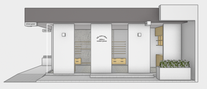 両ブランド共にL.Aにショップを構えており、国内では初出店となる「life store tokyo」。ショップコンセプトは、AKILAのコンセプトである” modern & mode “と、mister greenのコンセプト” sophisticated & simple “ の融合。違うコンセプトを掲げているブランドがマッチしながらも個性が引き立つように、コンクリートブロックやステンレスの無機質な素材にプライウッドの温かみをプラスし、洗練された雰囲気に仕上げられています。店内の造りはあえてシンプルにしており、シーズン毎に棚や植物を追加・変更して常に鮮度ある状態にアップデートできるように設計されました。また、トラフィックが多い立地に合わせて人や風、光が流れるような開放感を大切にしています。