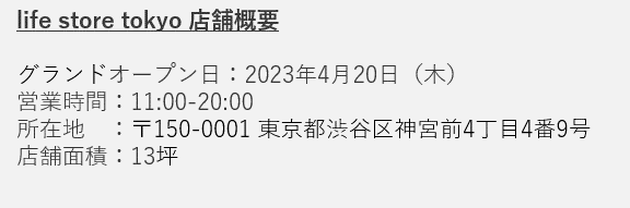 life store tokyoでは、セレクトショップとして店名にもあるようにアパレルの枠にとらわれずライフスタイルに基づいたブランド・アイテムを取りそろえてまいります。今後の展開にもご注目ください。