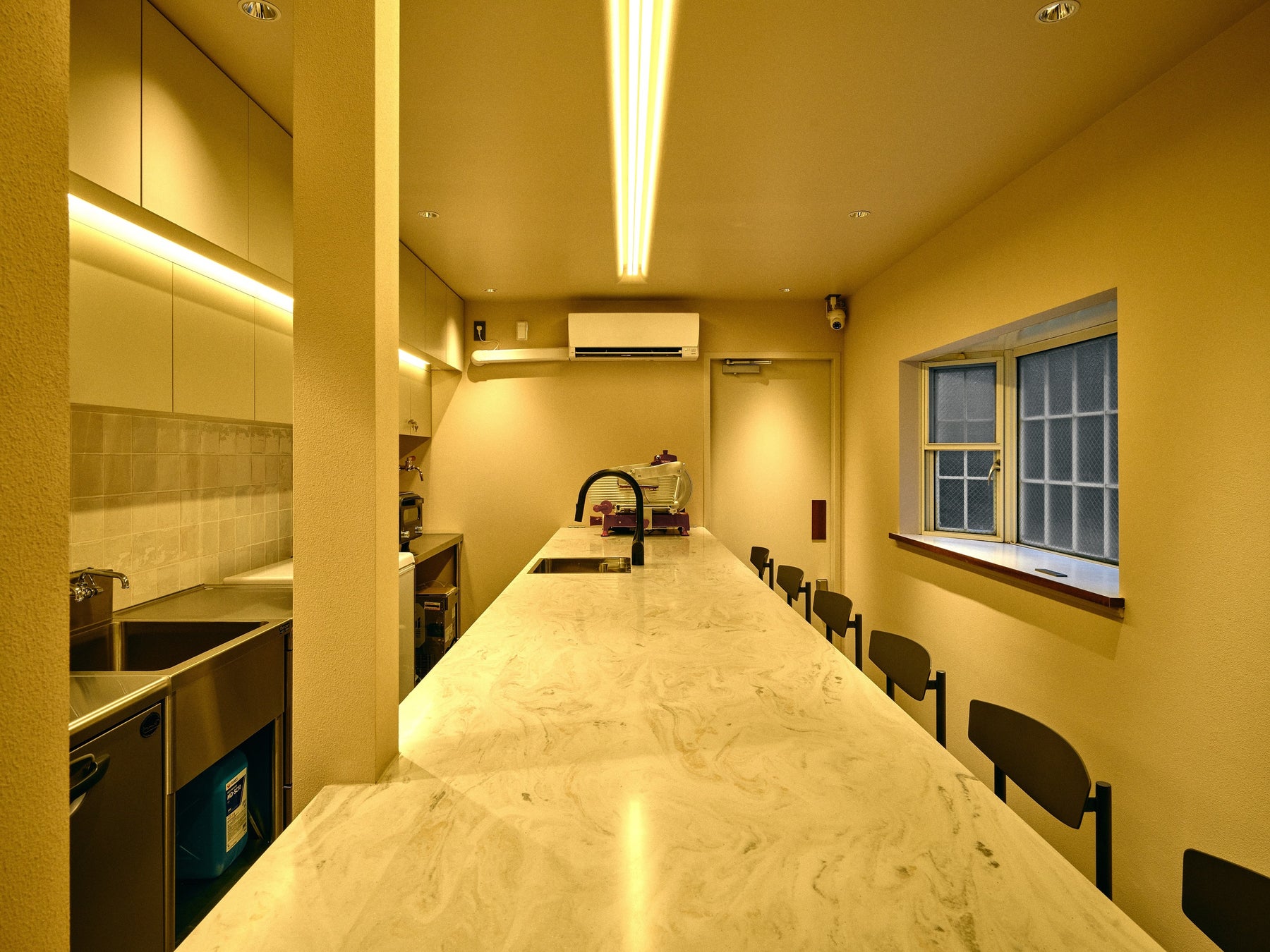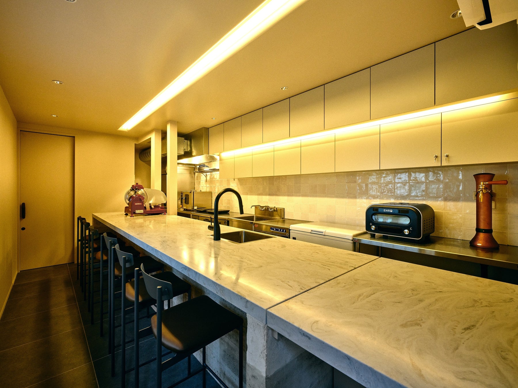 アパートの1階には、日中利用可能な住人専用のコワーキングスペースを設置。来客対応や打ち合わせにも適した設計で、Free Wi-Fiや全席にコンセントを備えています。夜も有料で利用可能で、プロ仕様のキッチンを完備しているため、料理教室やパーティーなどさまざまな用途に対応できます。