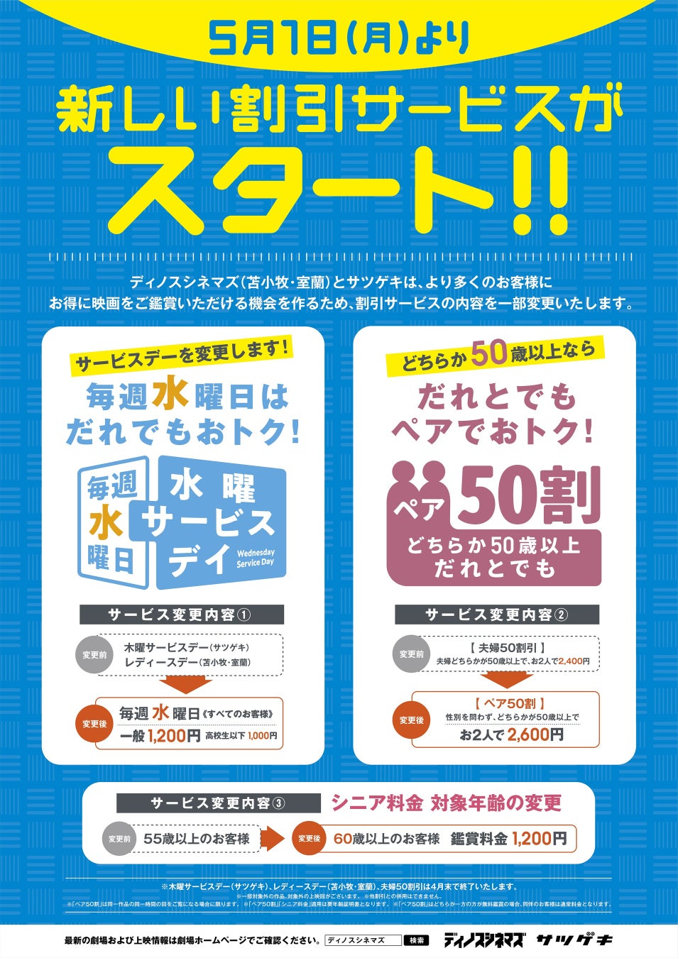 5.1(月)より毎週水曜日は「水曜サービスデイ」に、「夫婦50割引」は「ぺア50割」に【ディノスシネマズ・サツゲキ】