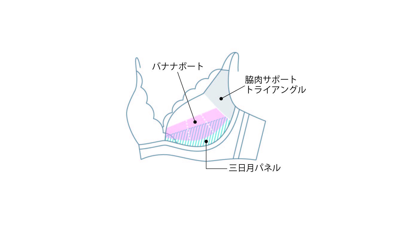 バストを中心へと導くL字型ノンワイヤーを採用。両胸のバージスラインをひとつにまとめて、離れたバスト胸を正しい位置へ誘導する。さらに、胸の広がりを抑える三日月パネルが、コンパクトかつ立体的なバストラインを作る。