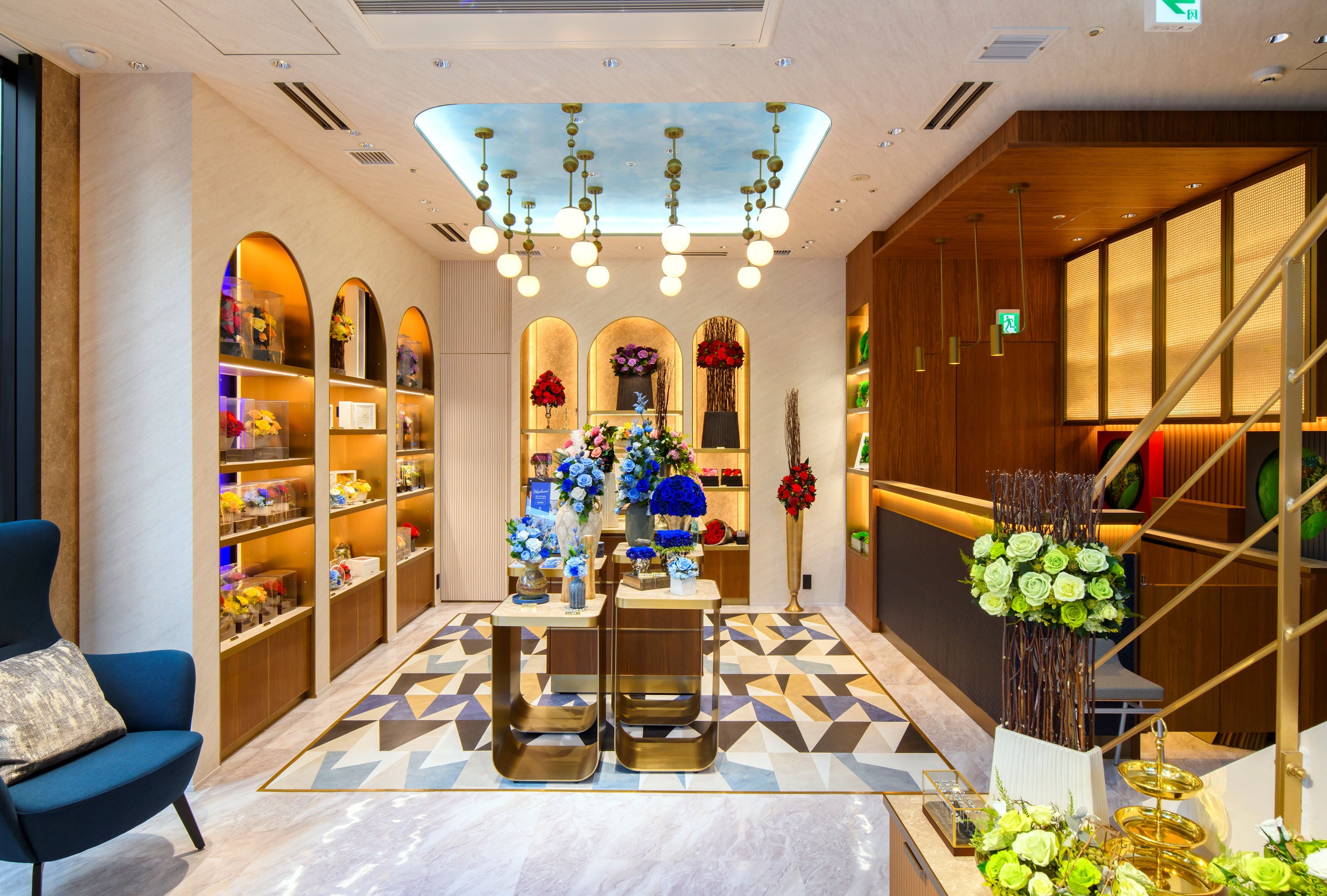 い体験を提供いたします。1階のプリザーブドフラワー専門店ではお祝いや記念日のギフトを販売。シックなインテリアに華やかな数々のプリザーブドフラワーが並び、高さ6m50cm・幅1m60cmの苔のプリザーブドフラワーの壁面装飾や特徴的なライティングが贅沢な空間を演出しています。また、ホーム・オフィス・ショップ等のインテリア装飾をオーダーメイドで提案する新サービス「Maison(メゾン)」をスタートし、2階のVIPルームでご要望をもとにフラワーデザイン装飾の専任チームが、唯一無二の作品をご提案いたします。