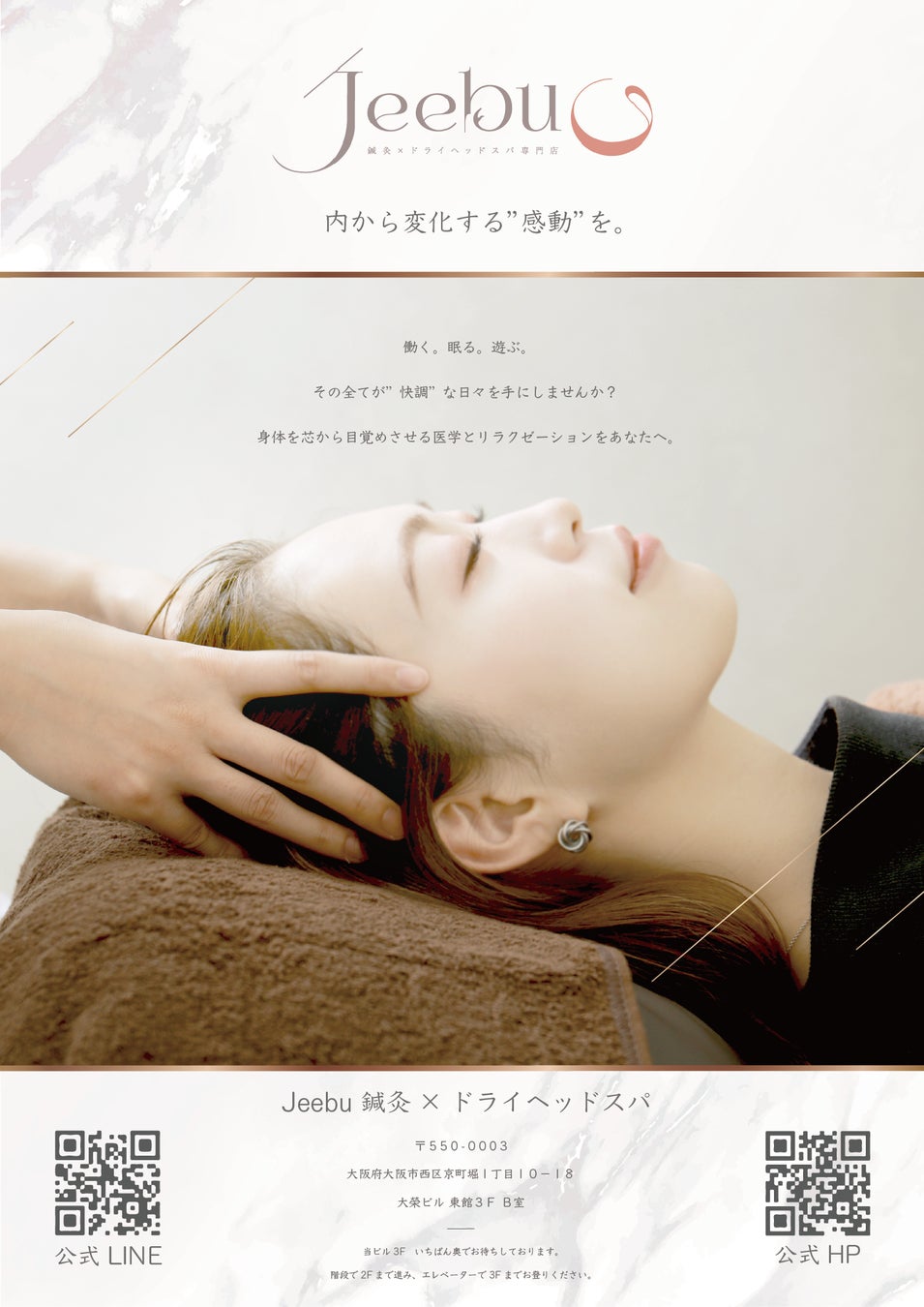 大阪肥後橋にあるjeebu鍼灸ドライヘッドスパ専門店は、国家資格保持者が監修したjeebuオリジナルメソッドの鍼灸治療とドライヘッドスパを同時に施術できる他にはない専門店です。