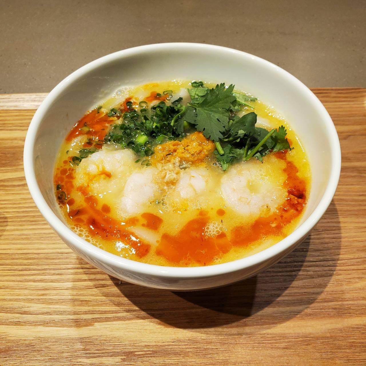 鶏白湯スープをベースに食べる海老ラー油「サテトム」を上からかけ、そのスープの上にはプリプリの海老たちが並びます。
