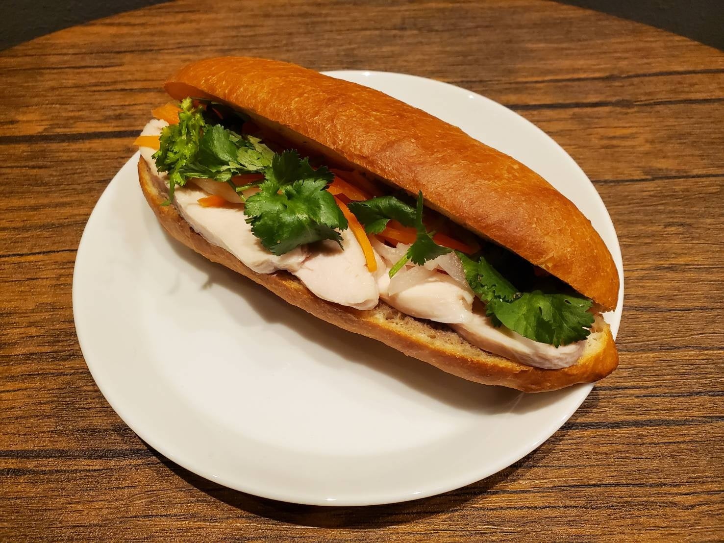 低温調理の自家製鶏ハム、なます、レバーパテをサンドした王道バインミー。