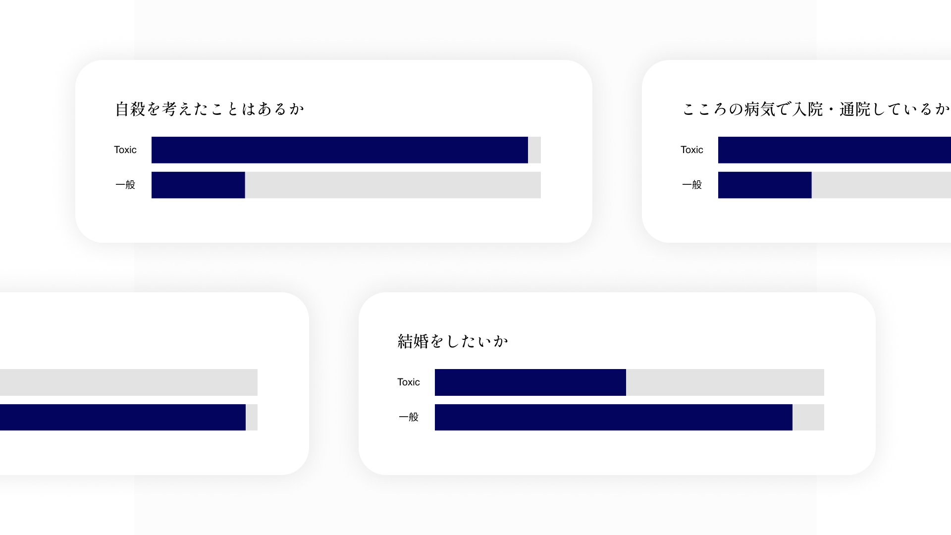世論調査などの国の調査と同じ質問を家庭環境に悩む人に行い、比較をしています。