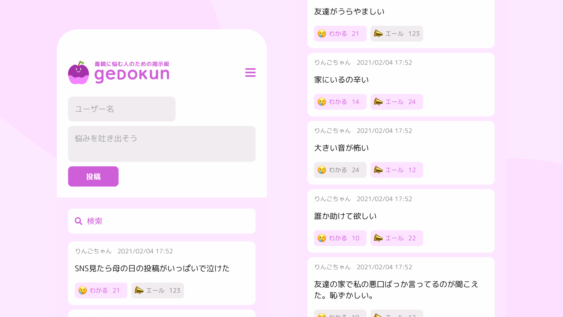 家庭環境の悩みが集まる掲示板。リプライ機能はなく、共感のボタンで励まし合います。