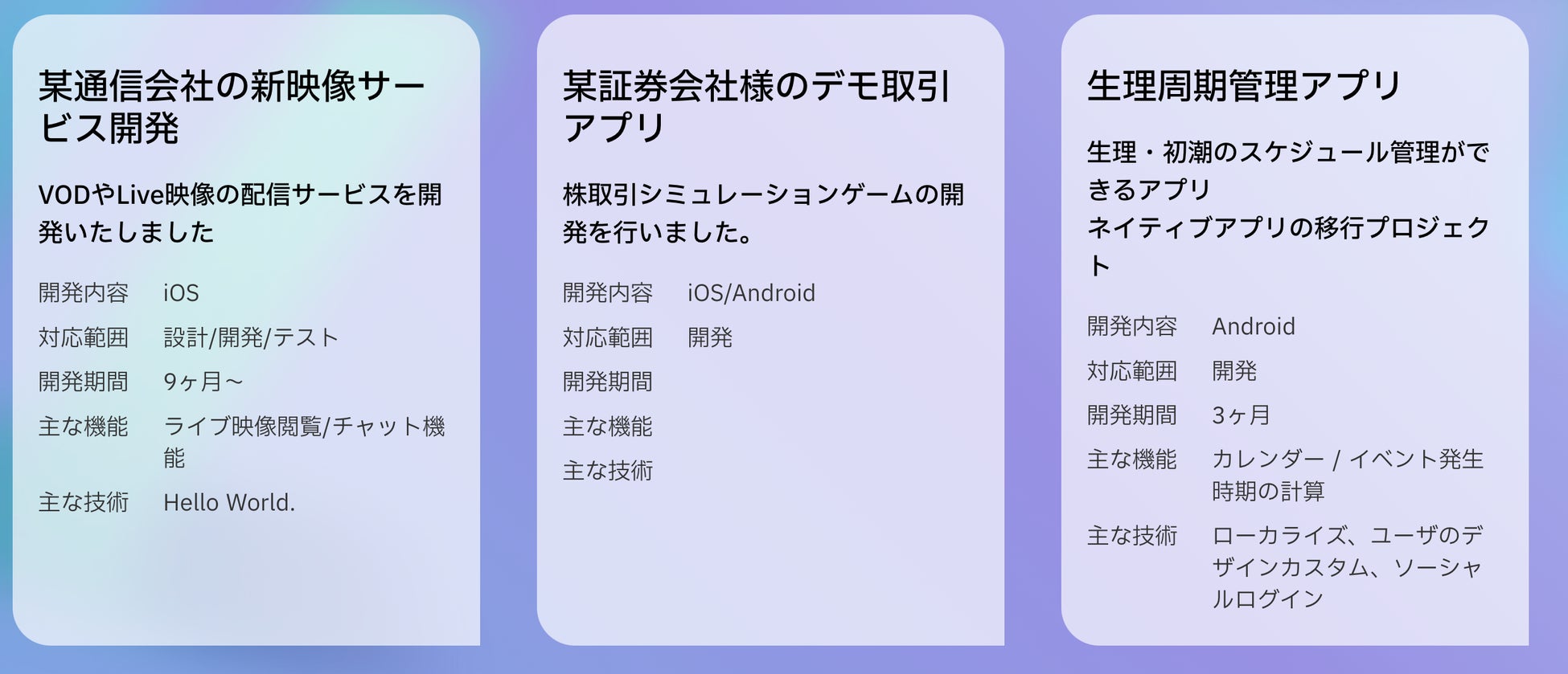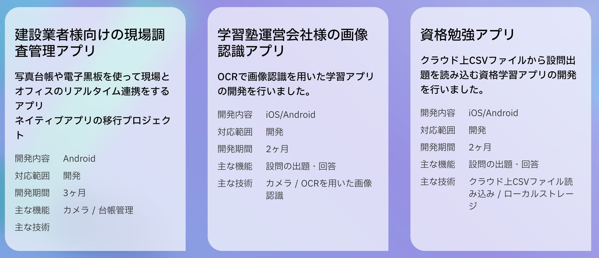 Flutter Codeは、豊富な開発経験を持つエンジニアたちが集結し、さまざまなアプリケーションの開発に対応しています。多岐にわたるアプリケーションの開発において、Flutter Codeは高度な技術力と迅速な対応力を発揮し、クライアントのビジネス成長をサポートしています。
