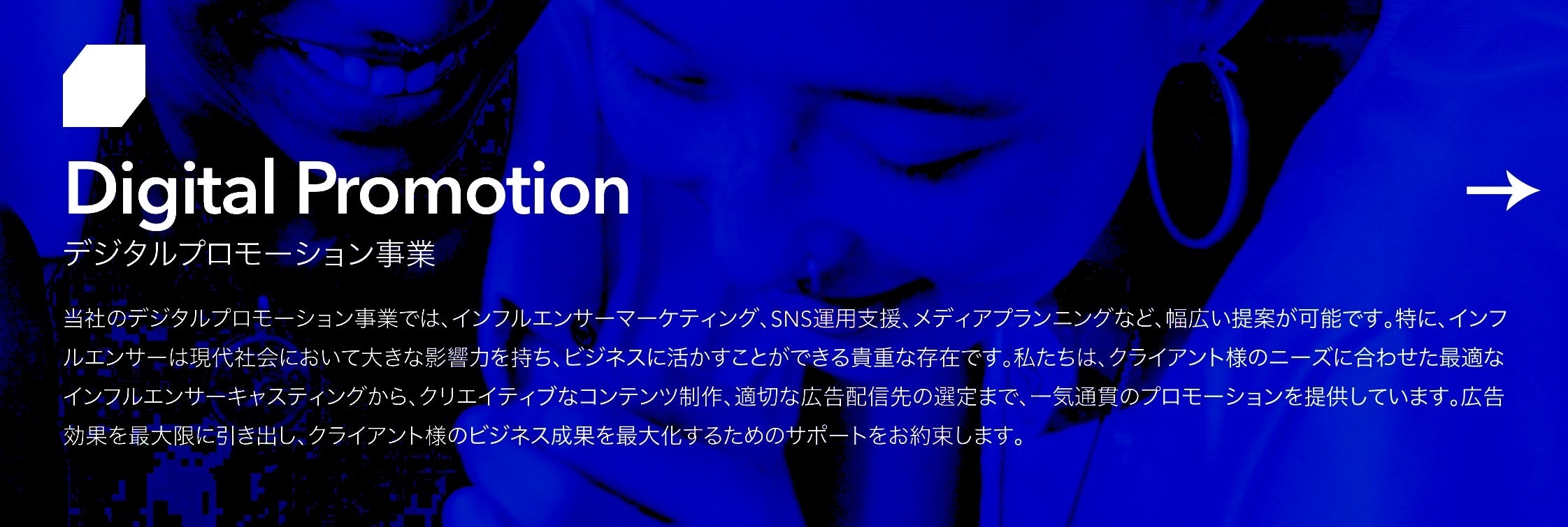 当社のデジタルプロモーション事業では、インフルエンサーマーケティングやSNS運用支援、メディアプランニングなど、多岐にわたるサービスを提供しています。