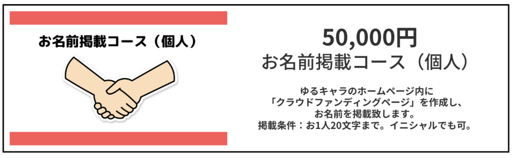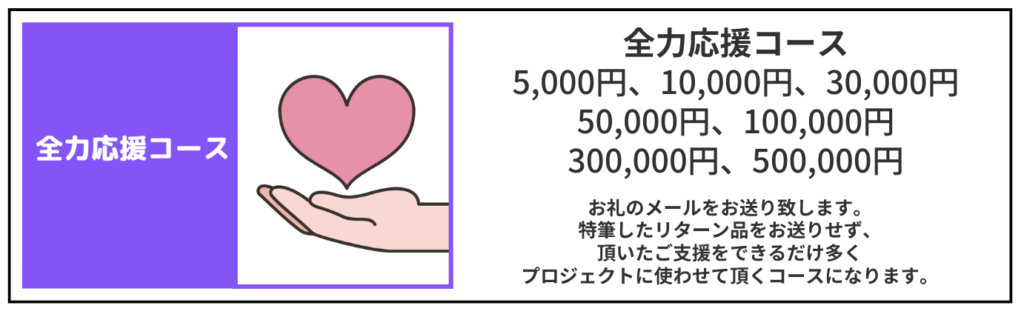 クラウドファンディングへの支援のコースと、支援して頂いた方に対するお礼の種類が以下になります。(※価格は全て税込み。尚、郵送は日本国内のみとさせて頂きます。)