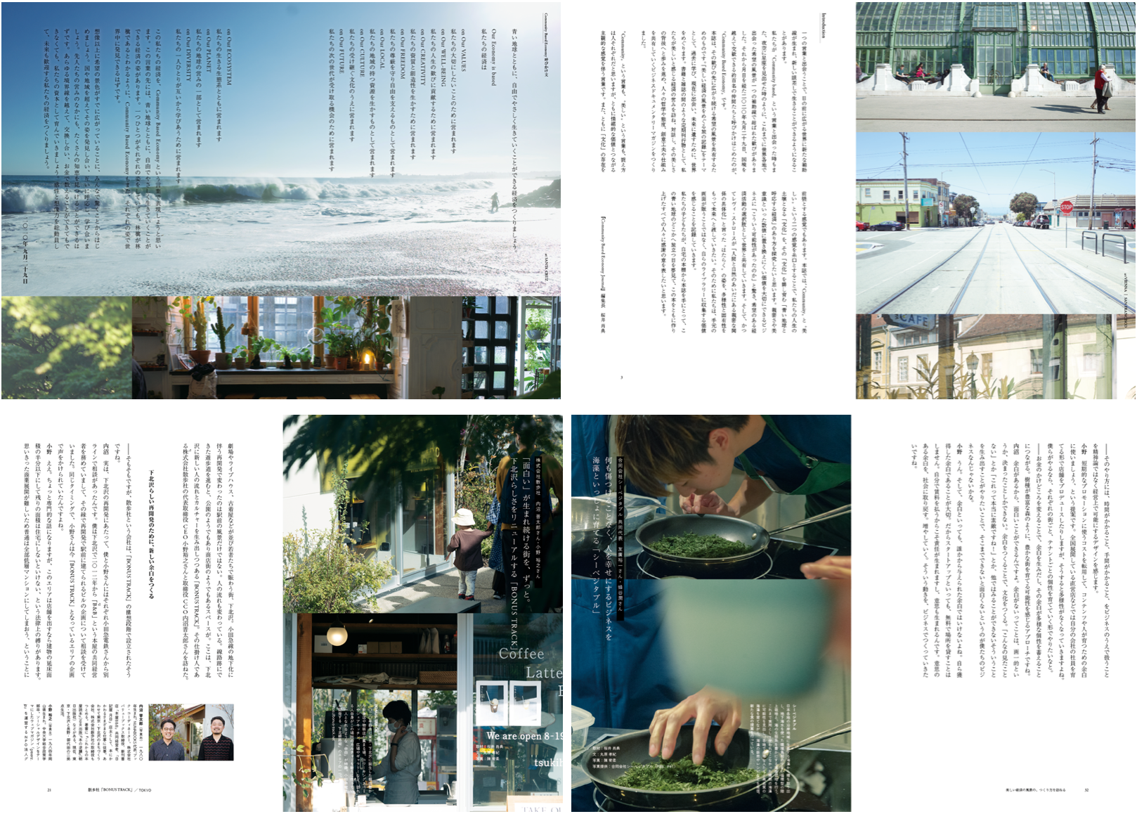 本誌は、“Community” と “美しい” という二つの感覚を糸口に、グローバルに展開する企業からローカルに根ざす商いまで、規模や拠点を問わず、私たちが美しいと感じる経済の営みを訪ね、対話し、その背後にある人々の哲学や態度、創意工夫や仕組みを各地のCommunity Based Companiesが取材・執筆したものです。