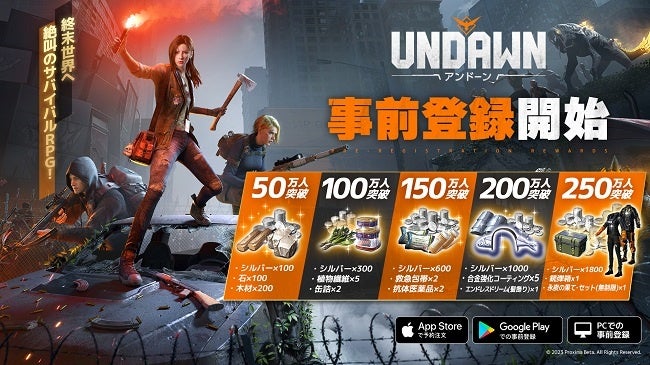 『Undawn(アンドーン)』の事前登録が本日より開始となりました。事前登録者数に応じて、シルバーや木材など、ゲーム内で使用できる報酬をプレゼントいたします。これらの報酬は、事前登録者の人数に応じてより豪華なものになりますので、ぜひ事前登録をお願いいたします。