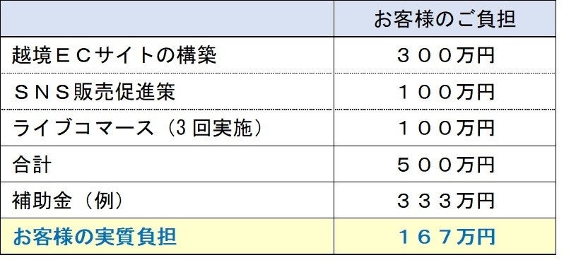 ※あくまでも一例であり、お客様が選択される越境ECサービスおよび補助金の内容によって異なります。また、各種補助金は必ず採択されるものではありません。