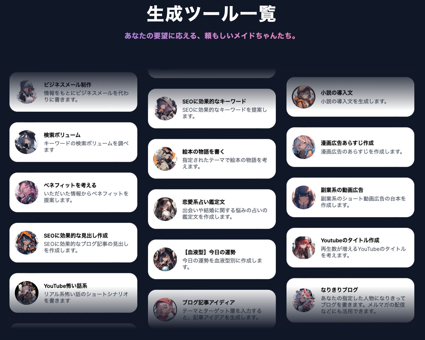 多種多様な記事のニッチな内容ごとに特化したそれぞれのメイドがあなたの代わりに記事を作成いたします。
