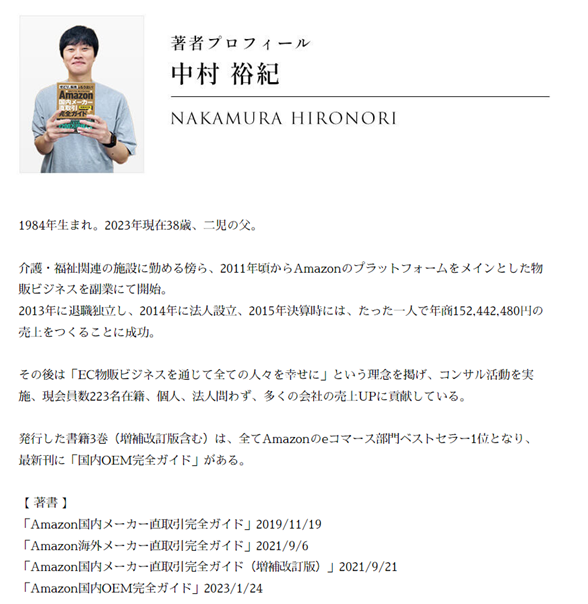 発行した書籍3巻(増補改訂版含む)は、全てAmazonのeコマース部門ベストセラー1位となり、最新刊に「国内OEM完全ガイド」がある。