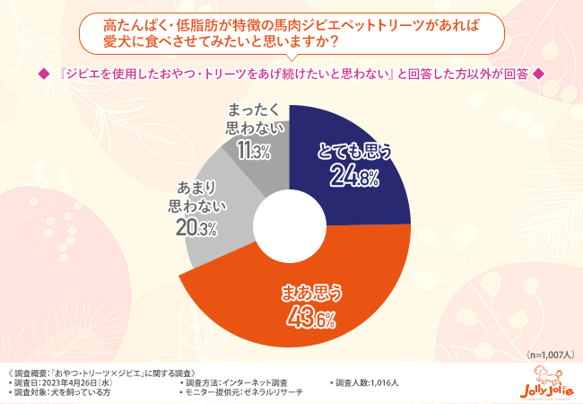 「高たんぱく・低脂肪が特徴の馬肉ジビエペットトリーツがあれば愛犬に食べさせてみたいと思いますか?」と質問したところ、『とても思う(24.8%)』『まあ思う(43.6%)』『あまり思わない(20.3%)』『まったく思わない(11.3%)』という回答結果になりました。