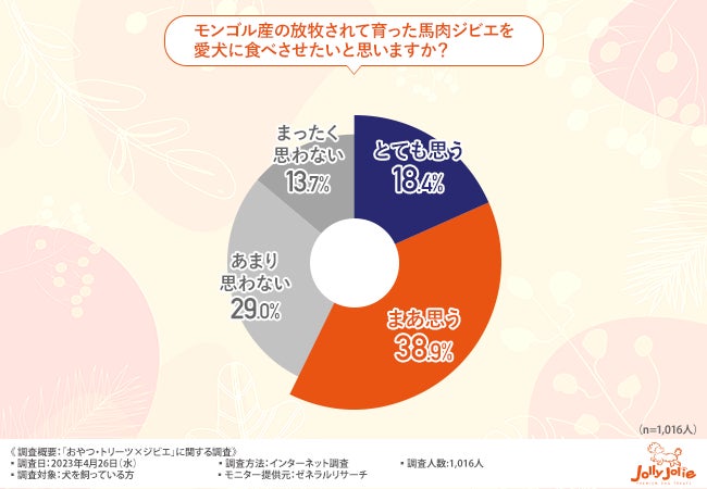 全員に、「モンゴル産の放牧されて育った馬肉ジビエを愛犬に食べさせたいと思いますか?」と質問したところ、『とても思う(18.4%)』『まあ思う(38.9%)』『あまり思わない(29.0%)』『まったく思わない(13.7%)』という回答結果になりました。