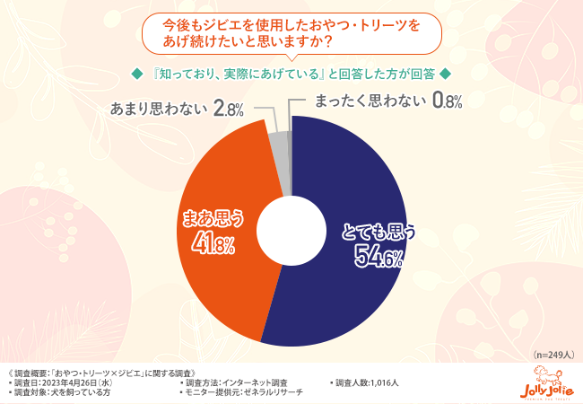 そこで、「今後もジビエを使用したおやつ・トリーツをあげ続けたいと思いますか?」と質問したところ、『とても思う(54.6%)』『まあ思う(41.8%)』『あまり思わない(2.8%)』『まったく思わない(0.8%)』という回答結果になりました。