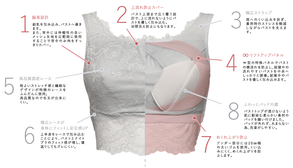 バストサイドに配置された∞型リフトアップパネルがバストの横流れを防止。お休みの日や就寝中にリラックスしながらバストの崩れを防ぎます。