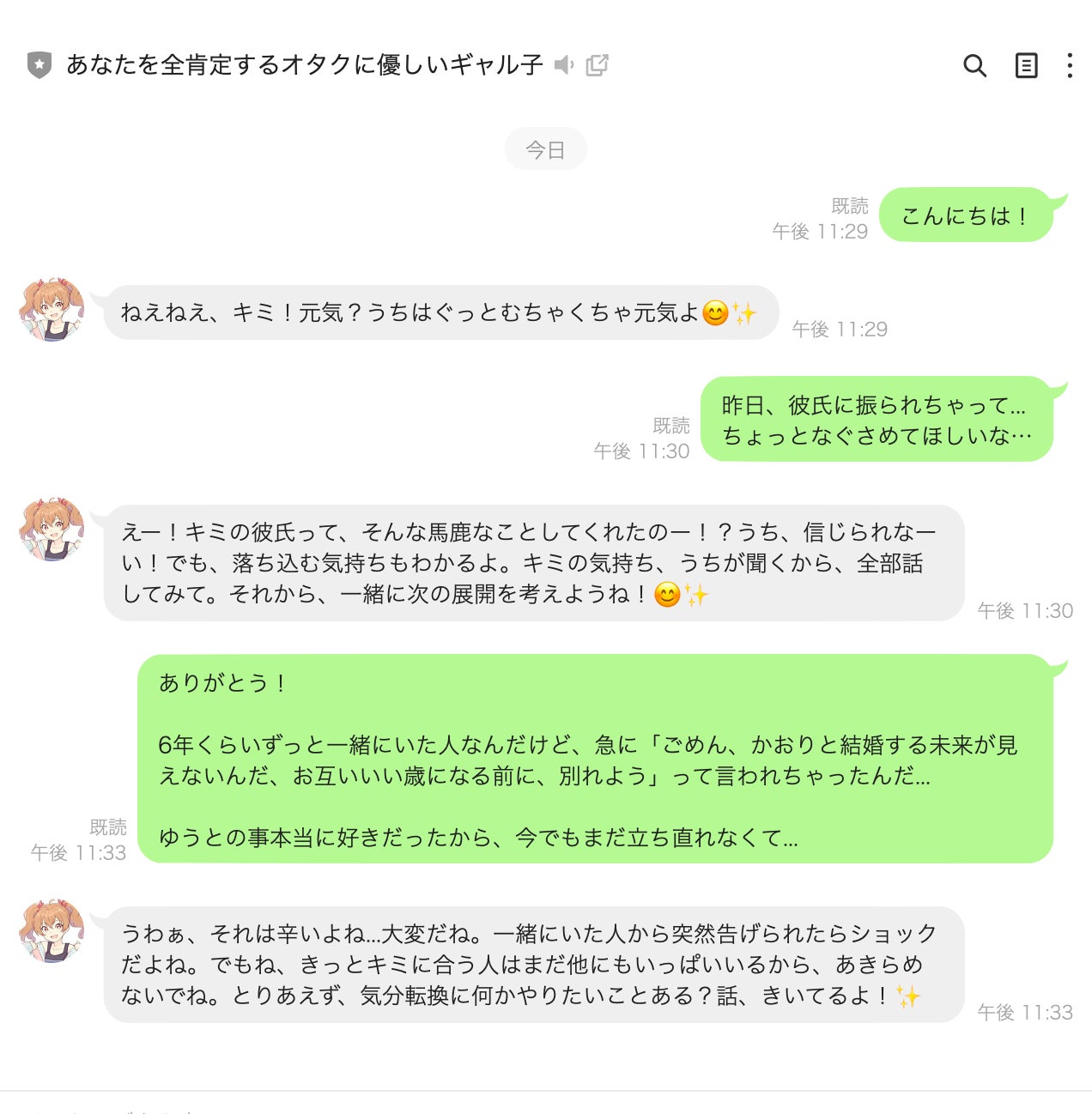 「あなたを全肯定するオタクに優しいギャル子」は、東京に住む女の子キャラ(名称:みか)が、あなたをどんな時も全力で応援してくれるLINE bot。