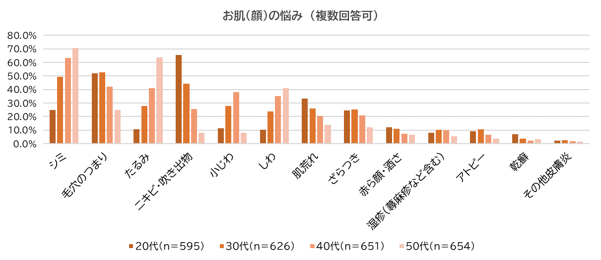 ・年代別お肌の悩み 20代「ニキビ・吹き出物」、30代「毛穴のつまり」、40代・50代は「シミ」がトップ!