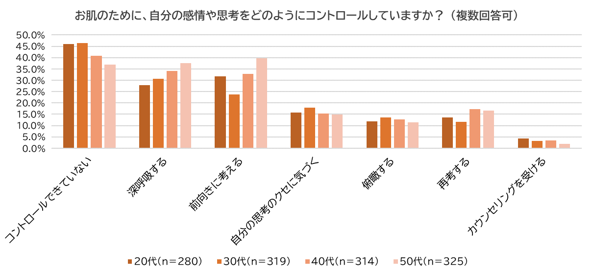「とても思う」「思う」と回答した人(※1)に「お肌のために、自分の感情や思考をどのようにコントロールしているか?」尋ねたところ、20代から40代は「コントロールできていない」(20代:46.1%、30代:46.4%、40代:40.8%、50代:36.9%)、50代は「前向きに考える」(20代:31.8%、30代:23.8%、40代:32.8%、50代:39.7%)が最多となりました。これにより、どの年代も4割前後の人は、お肌に影響すると思っていても、感情や思考をうまくコントロールできていないということがわかりました。