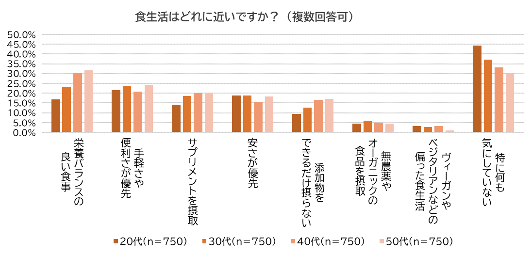 今度は、「食生活はどれに近いか?」尋ねてみたところ、どの年代も「特に何も気にしていない」(20代:44.3%、30代:37.2%、40代:33.2%、50代:30.1%)が最多で、若い年代ほど高い傾向にありました。また、「栄養バランスの良い食事」(20代:16.9%、30代:23.2%、40代:30.4%、50代:31.6%)や「添加物をできるだけ摂らない」(20代:9.5%、30代:12.7%、40代:16.5%、50代:17.1%)は、年代が上がるにつれ高くなり、「手軽さや便利さが優先」(20代:21.6%、30代:23.7%、40代:20.8%、50代:24.3%)はどの年代も2割超いることがわかりました。