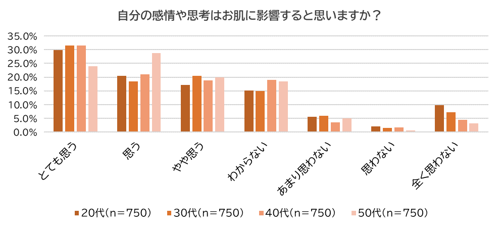 次に、「自分の感情や思考はお肌に影響すると思うか?」尋ねました。20代から40代は「とても思う」(20代:29.9%、30代:31.5%、40代:31.5%、50代:24.0%)、50代は「思う」(20代:20.4%、30代:18.4%、40代:21.1%、50代:28.8%)が最多となり、「やや思う」も含めると、どの年代も7割前後(20代:67.3%、30代:70.3%、40代:71.3%、50代:72.7%)の人が、自分の感情や思考によりお肌は変化すると思っているようです。