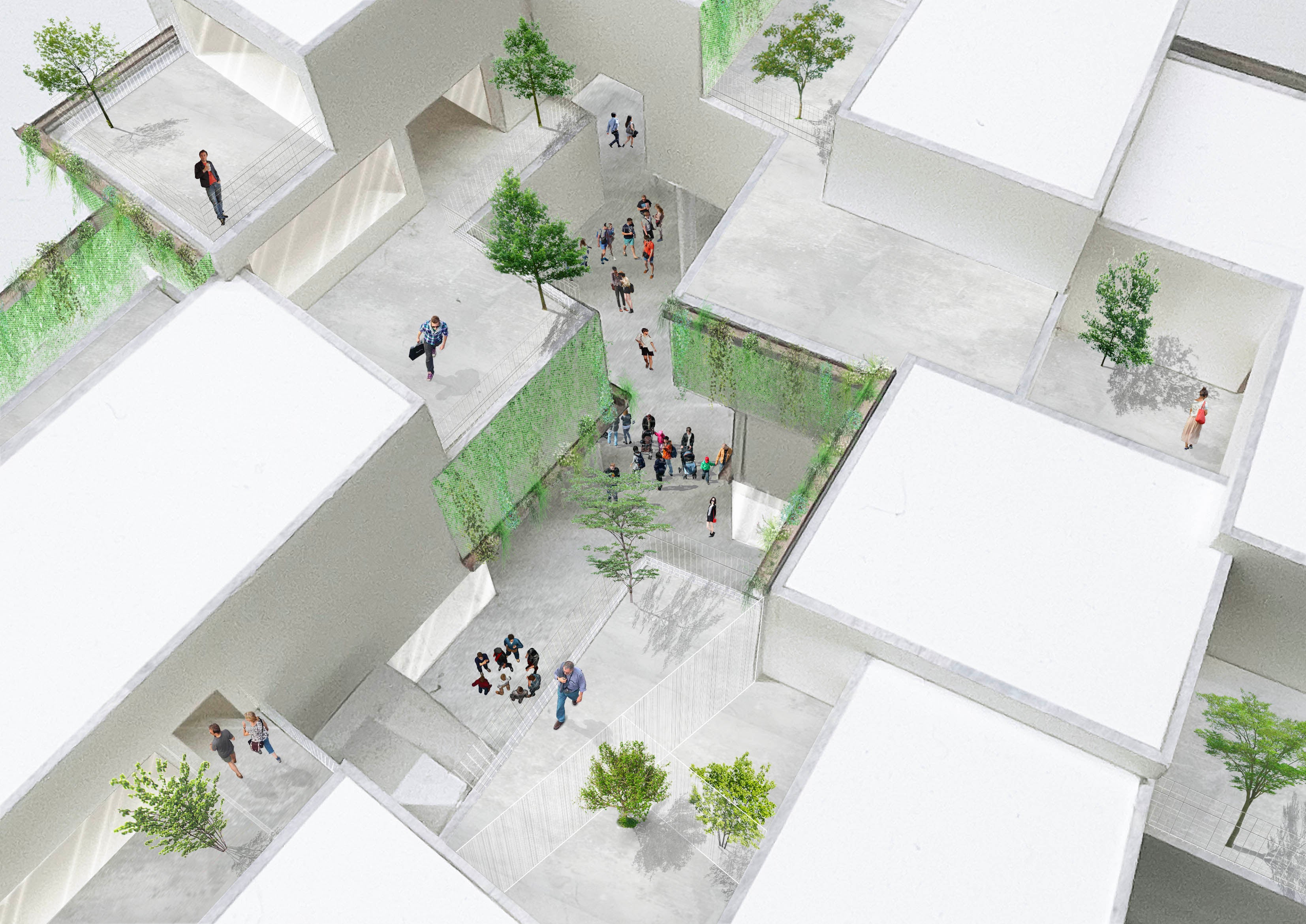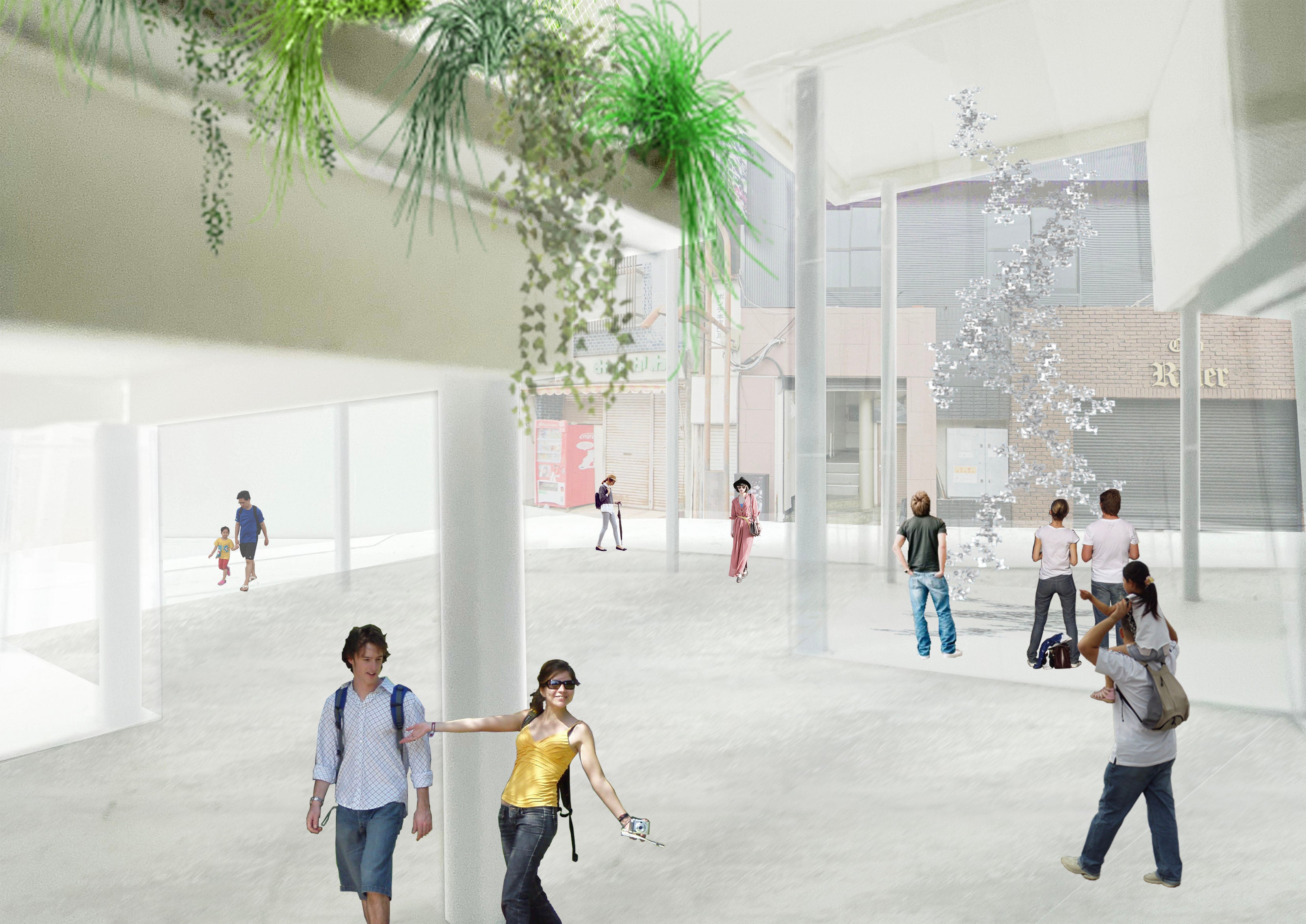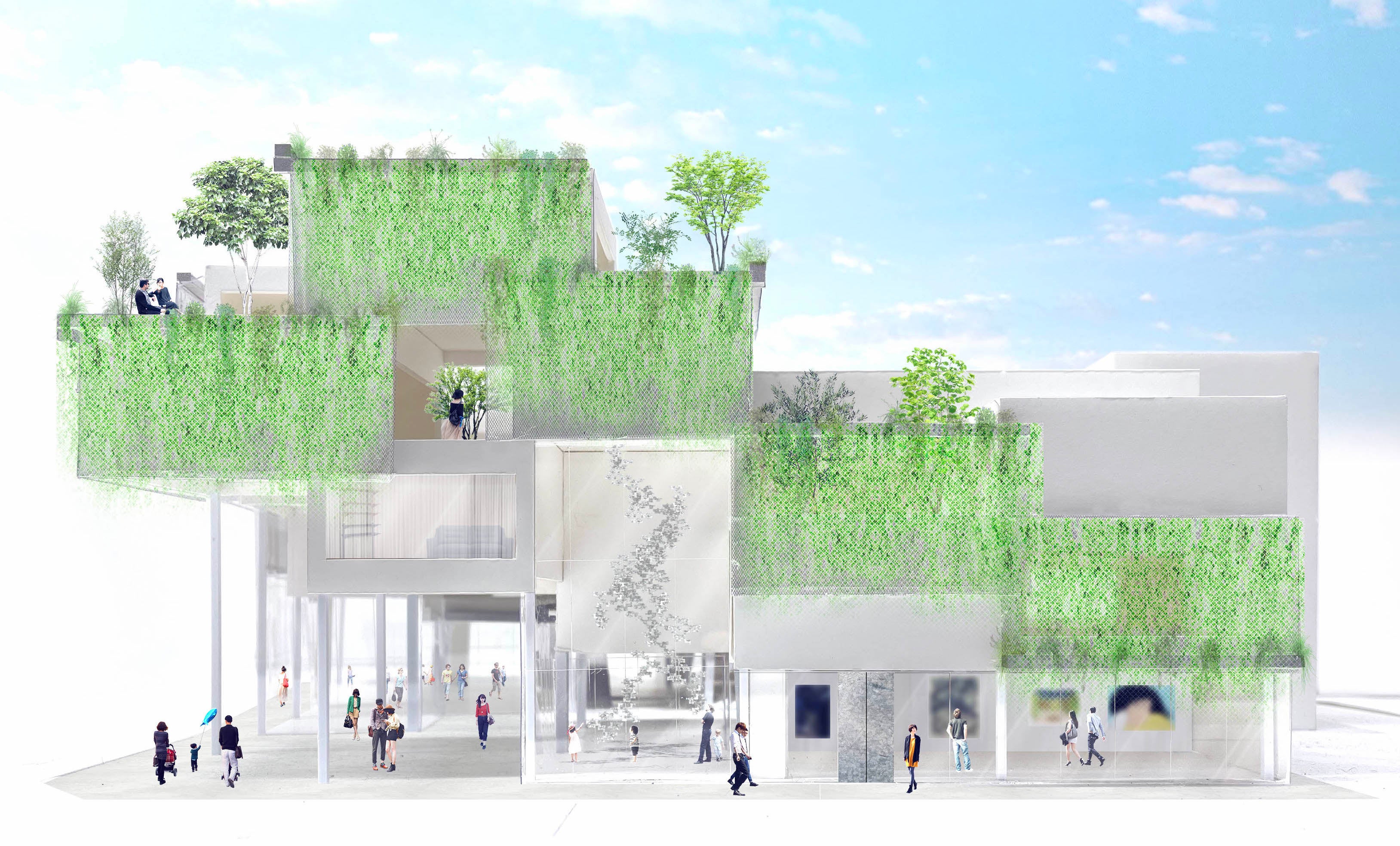 「この場所はどんな新しいひろばに生まれ変わるでしょうか。私たちは大きな樹冠のように緑化されたボリュームを浮かべ、一本の樹の下に人々が集まるように、人々の自由な活動で満ちた場所をつくりたいと考えました。樹冠の中にはたくさんの住居があります。全て、庭のような大きなテラスを持ち、自然と混ざった大らかな住戸です。樹の下にはギャラリーやレストラン、屋外のオープンな居場所が入り混じる、ユニークなひろばができます。めぶく緑や街の生命力とつながった、生き生きとした建築をつくりたいと思います。 」平田晃久