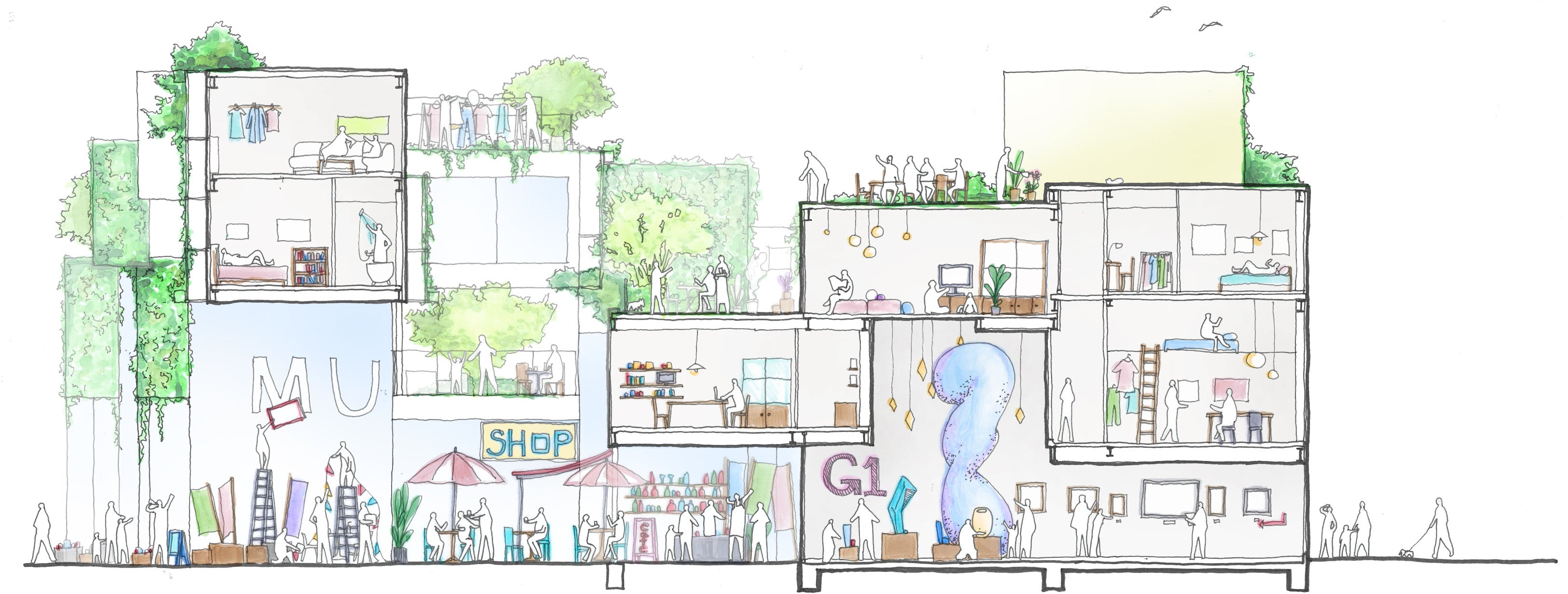 「これからのまちを象徴するアイコンは前橋の新たな価値を創造する人々が 集い語らい暮らす場所。進化しつづける前橋の中心地。アートと生活空間が共生するコーポラティブクリエイションハウス、まえばしガレリア。」谷川じゅんじ