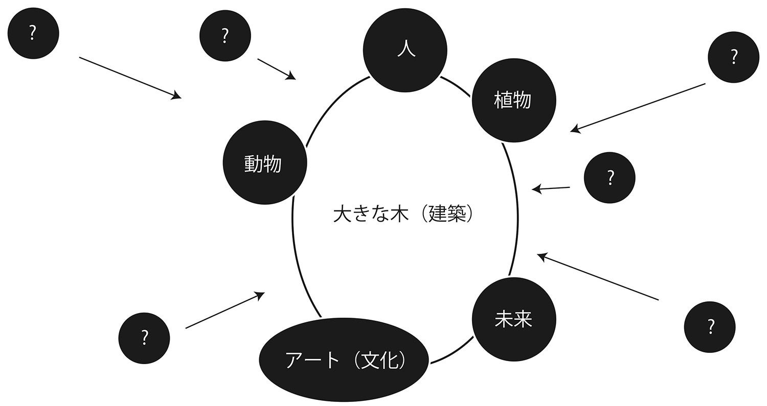 「建築コンセプトの「大きな木をつくった」という事は、そこに人も集う、物も入ってくる、今後、新たな仲間や価値観が足されていく。大きな木に鳥が何かを運んできて、そこからまた新たな芽吹きも生まれていく。その様な進行形の状態をデザインで表現しました。」平野篤史