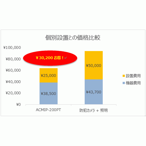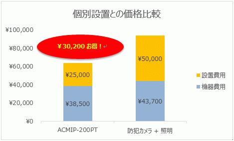 もう一点、コスト面での効果も重要部分として挙げられます。照明と防犯カメラを別々に設置する場合と比較して、ACMIP-200PTは設置・設備費用を抑えられます。(下表参照)