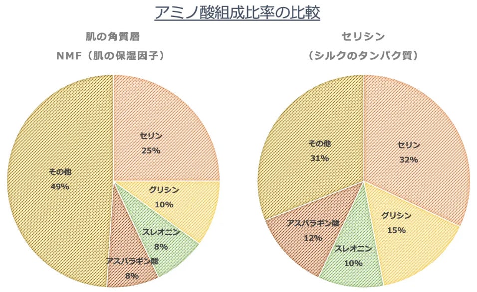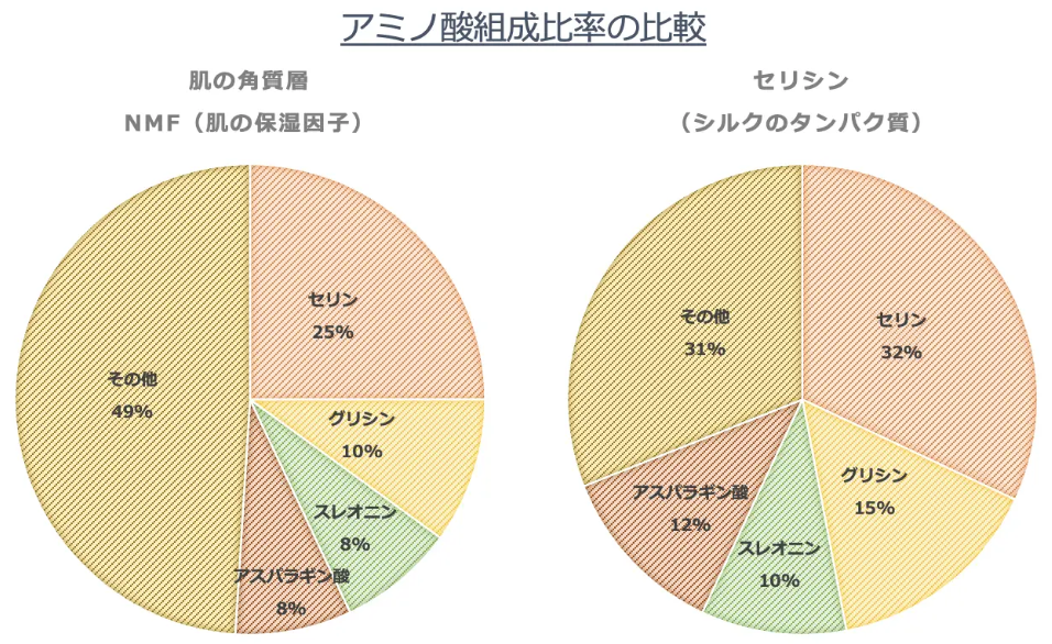 上記円グラフのように、「セリシン」は人の肌の天然保湿因子(NMF)とよく似た作りをしているため、肌との親和性がとても高く、肌に負担を与えることなく自然に馴染み、保湿を助けてくれるのです。